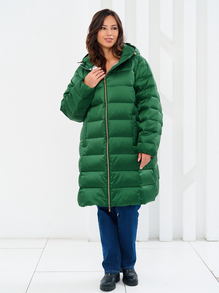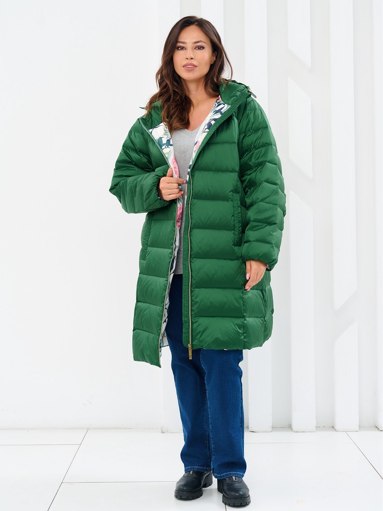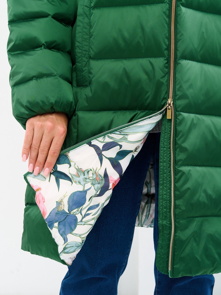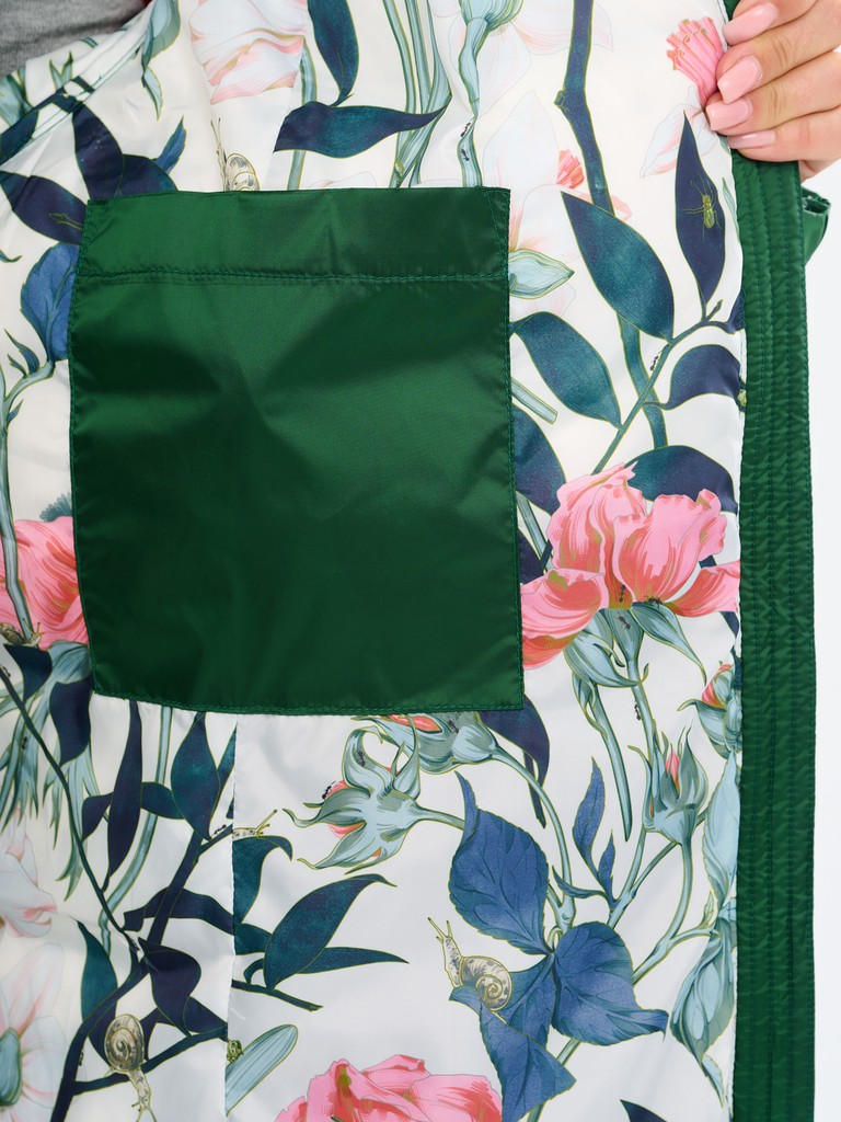 Пальто-пуховик женское прямого силуэта с высоким воротником и капюшоном произведено из прочного водоотталкивающего материала. Тканевая подкладка с уникальным принтом, напоминающим о летних цветущих полях и их обитателях, не оставит равнодушным никого. Застежка-молния с двухсторонним раскрытием. Изделие имеет втачной рукав, по низу имеется внутренняя фиксирующая резинка. На внутренней стороне куртки имеется накладной карман. На лицевой стороне полочки пуховика расположены функциональные карманы с листочкой и застежкой на кнопку. Объемный капюшон с резинками-фиксаторами позволяет укрыться от непогоды. Графическая стежка удерживает пуховой утеплитель, упакованный в двойной пух-пакет.