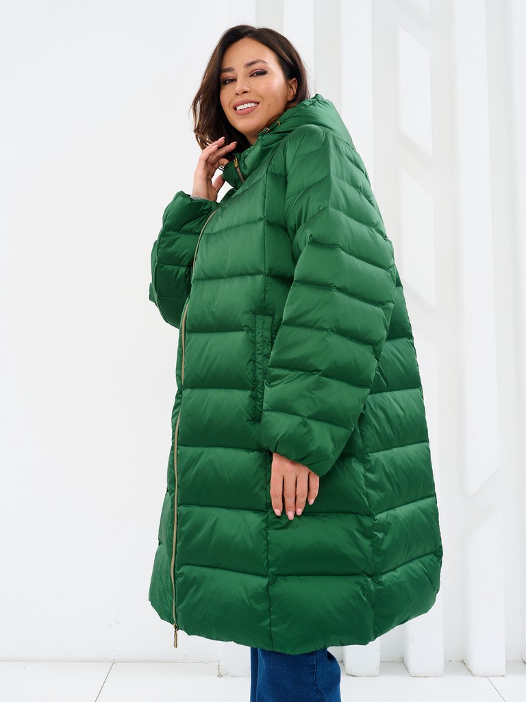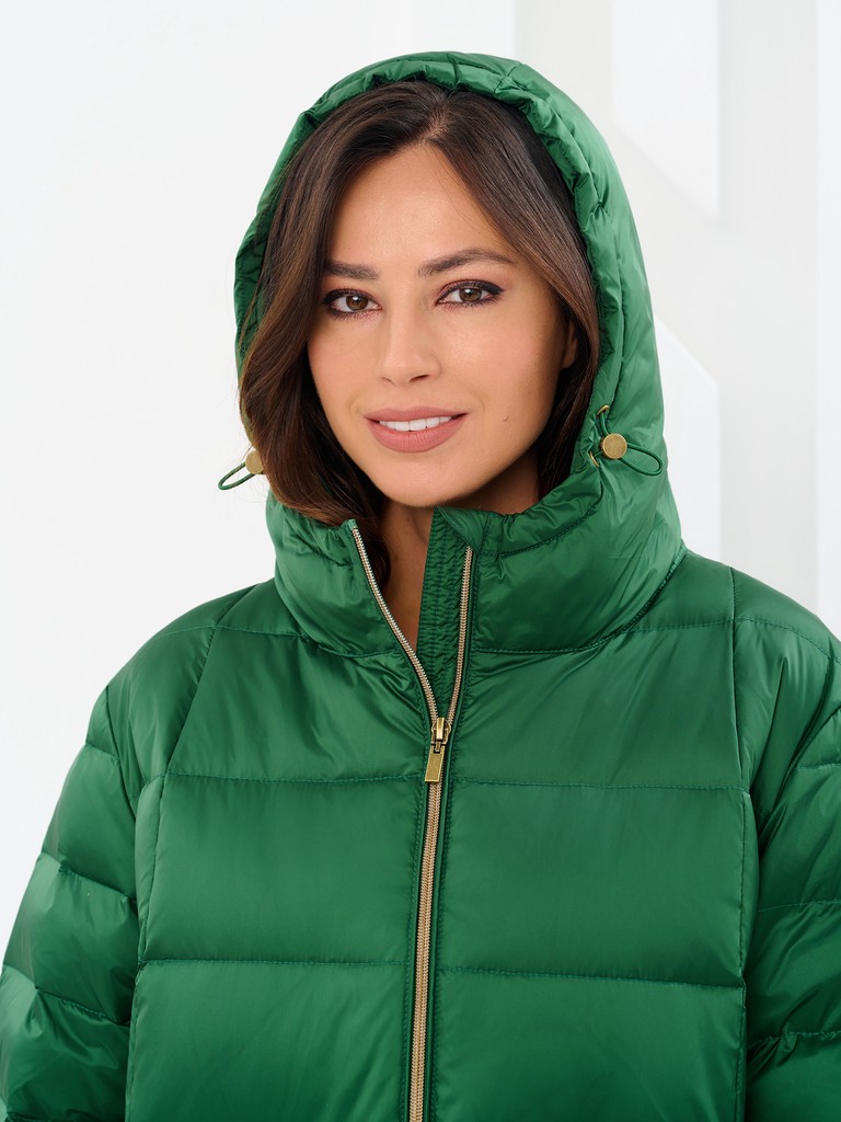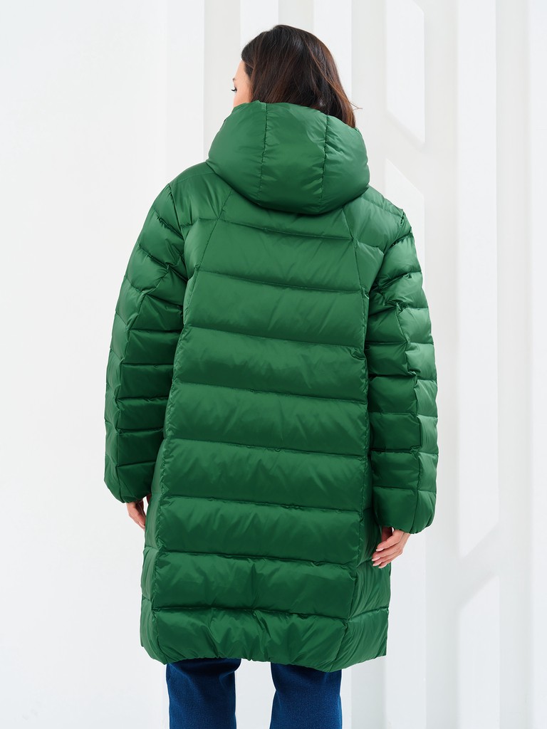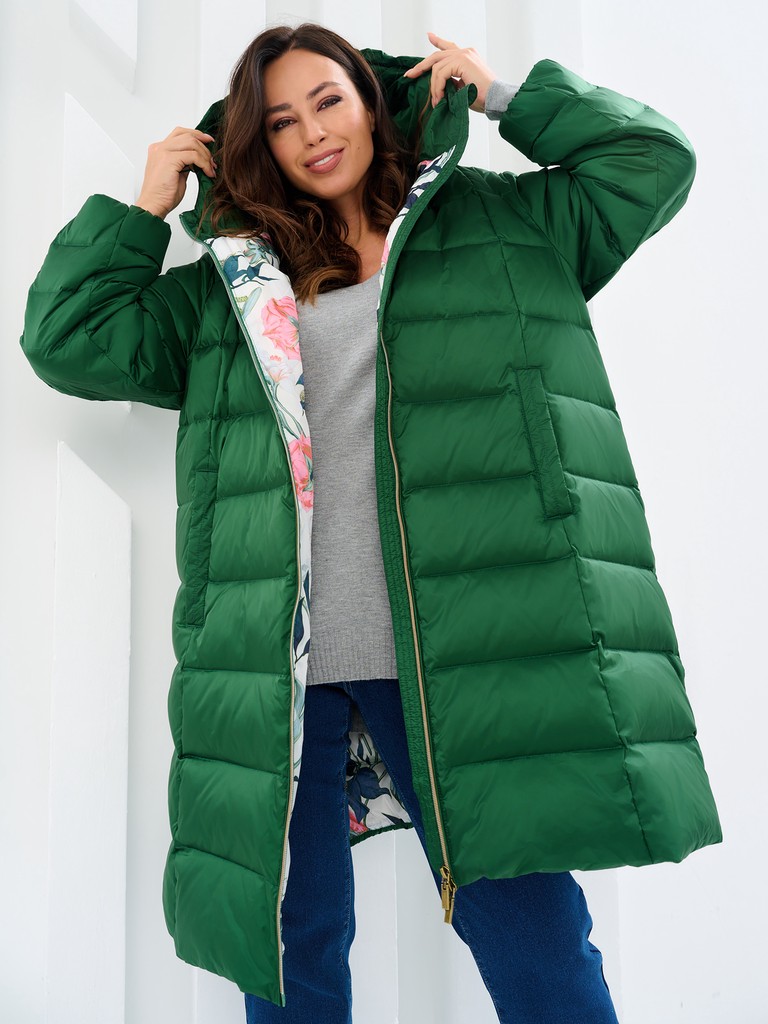 Пальто-пуховик женское прямого силуэта с высоким воротником и капюшоном произведено из прочного водоотталкивающего материала. Тканевая подкладка с уникальным принтом, напоминающим о летних цветущих полях и их обитателях, не оставит равнодушным никого. Застежка-молния с двухсторонним раскрытием. Изделие имеет втачной рукав, по низу имеется внутренняя фиксирующая резинка. На внутренней стороне куртки имеется накладной карман. На лицевой стороне полочки пуховика расположены функциональные карманы с листочкой и застежкой на кнопку. Объемный капюшон с резинками-фиксаторами позволяет укрыться от непогоды. Графическая стежка удерживает пуховой утеплитель, упакованный в двойной пух-пакет.