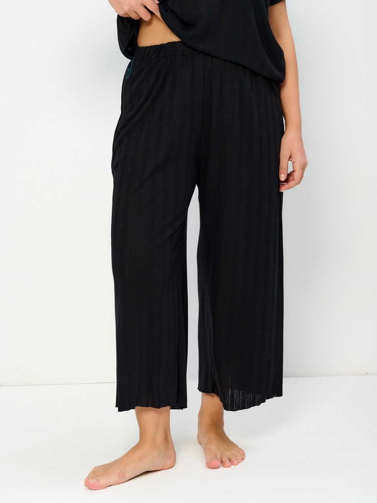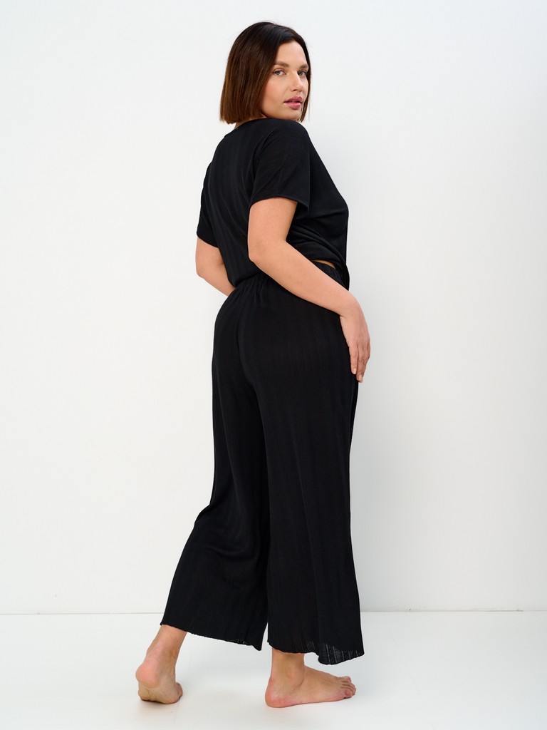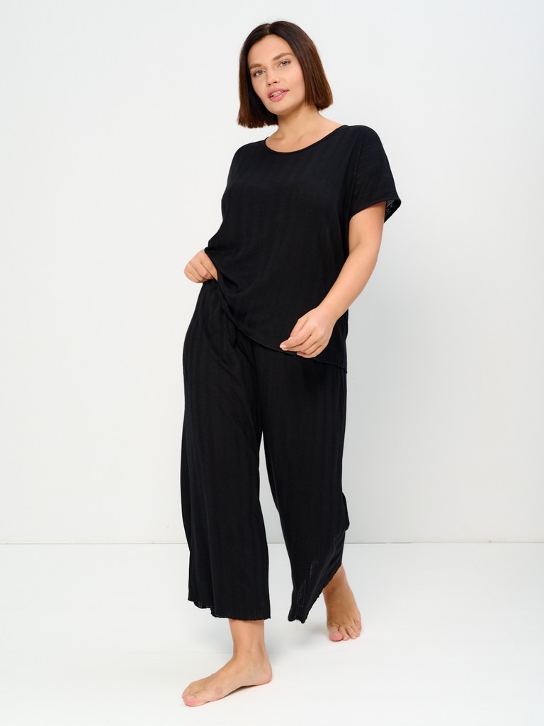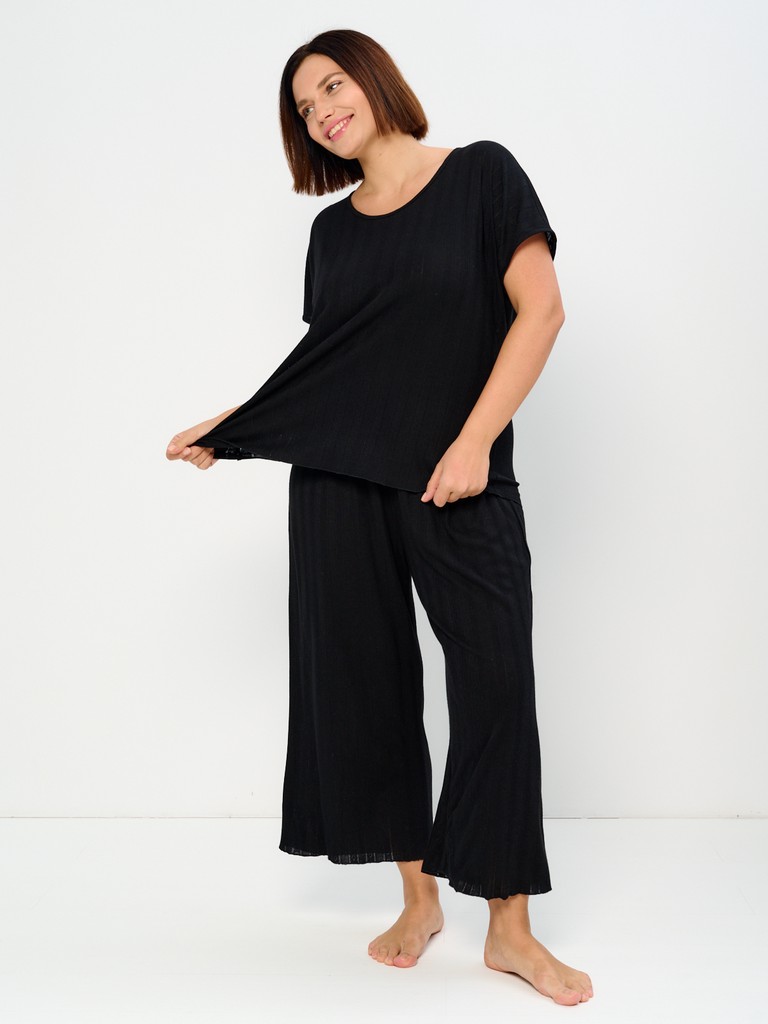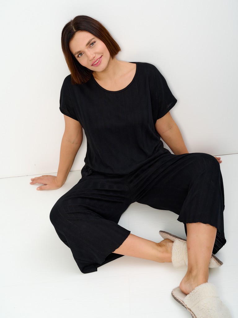 Пижама женская свободного кроя создана для идеального комфортного отдыха дома. Брюки на мягкой эластичной резинке длины 7/8, футболка свободного кроя с цельнокроеными короткими рукавами и комфортной широкой горловиной не создаст никакого дискомфорта при эксплуатации. Полотно для данной пижамы подобрано специально с добавлением эластана, чтобы не вытягивались колени, но при этом это тончайший, дышащий хлопок, позволяющий насладиться мягкостью и легкостью изделия. Утонченный рисунок-выработка добавляет гигроскопичность в нательное изделие. Благодаря простоте в уходе и свободе в движении данная пижама станет вашей любимой деталью домашнего гардероба.